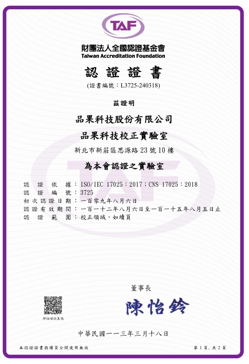 品果科技校正實驗室依據 ISO/IEC 17025:2017 ; CNS 17025:2018 之規範要求, 建立完善管理系統,實驗室活動所使用之查核件與標準件均追溯至國家標準,確保校正追溯之有效性。